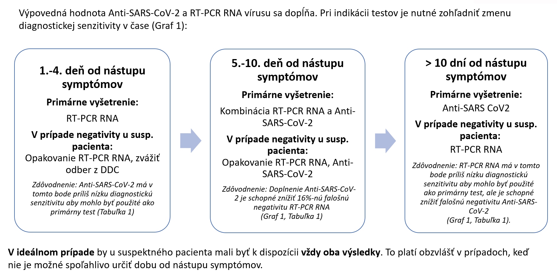 Tabuľka 1: Zmena diagnostickej senzitivity laboratórnych vyšetrení COVID-19 v čase